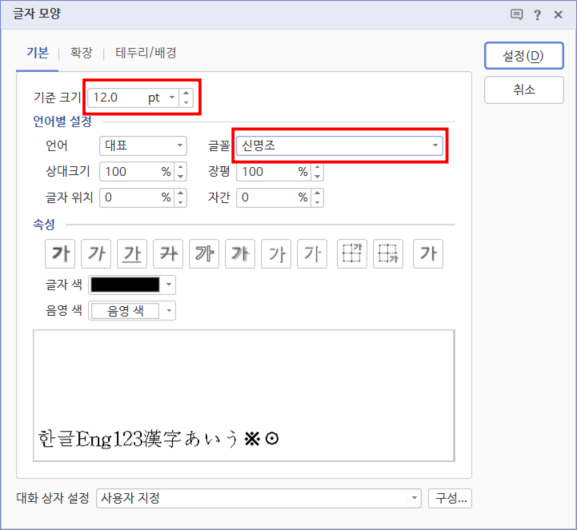 3. [글자 모양] 대화 상자 [기본] 탭에서 [기준 크기] 12pt, [글꼴] 신명조로 지정한 후 <설정>을 클릭합니다.