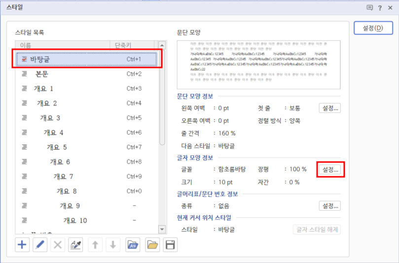 2. [스타일] 대화 상자의 [스타일 목록]에서 '바탕글'을 선택하고 [글자 모양 정보]에서 [설정]을 클릭합니다.