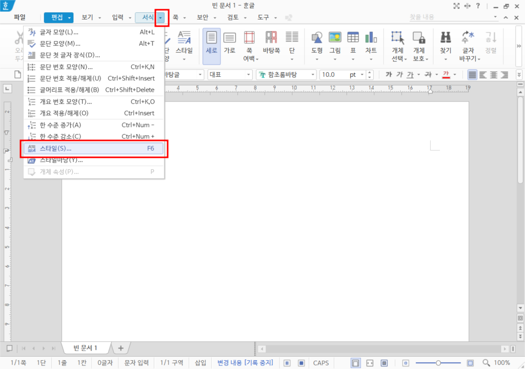 1. [서식]-[스타일] 메뉴를 선택하거나 [F6] 키를 누릅니다.