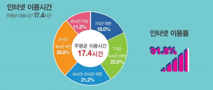 우리나라 국민은 주 평균 17.4시간, 대다수가 하루에 1회 이상(93.9%) 인터넷을 이용하는 것으로 나타났다. 1년 전 조사대비 주 평균 이용시간은 0.9시간 늘어났다. 주요 이용목적은 소통을 위한 커뮤니케이션(95.4%), 정보수집(94%), 게임·영화 등 여가활동(94%) 등이었다.