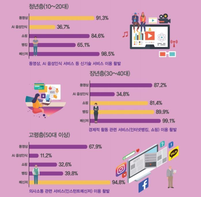 과기정통부는 최근 1인미디어 증가, 동영상 서비스, 인공지능(AI) 등의 기술·서비스가 국민의 일상생활 속으로 빠르게 자리 잡고 있는 환경을 고려해 이번 실태조사에서 동영상, AI, 5G 등 신규 서비스의 이용행태를 처음으로 조사, 기술 발달에 따른 국민생활의 변화를 분석했다.