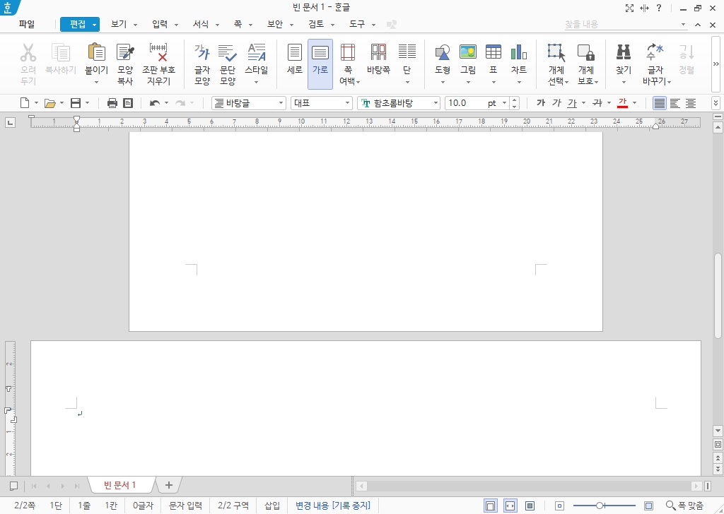 1. 편집 용지를 설정하고 작성 중인 문서의 마지막에 커서를 두고 [쪽]-[편집 용지] 메뉴를 선택하거나 [F7] 키를 누릅니다.